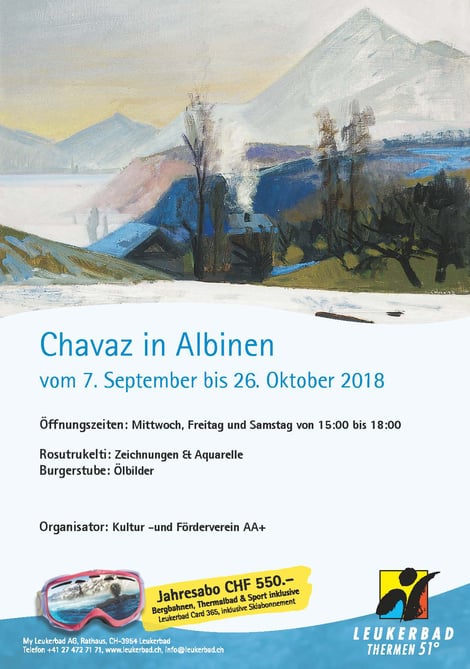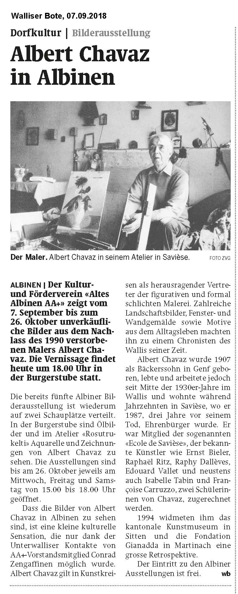 Albert Chavaz (1907 - 1990) war - obwohl kein Walliser - einer der herausragenden Maler des kulturellen Lebens im Wallis, Er war ein Chronist des Walliser Lebens. Malen war für Albert Chavaz immer eine Ausdrucksform, die für alle zugänglich sein sollte.Albert Chavaz war ein wichtiges Mitglied der renommierten, sogenannten "Ecole de Savièse". Dazu gehörten Maler, die sich in Savièse aufhielten und dort ihre Kunst ausführten. Bekannte Mitglieder dieser Gruppe waren: Ernst Bieler, Raphaël Ritz, Raphy Dallèves, Edourard Vallet und neuestens auch Isabelle Tabin und Françoise Carruzzo, ehemalige Schülerinnen von Chavaz.