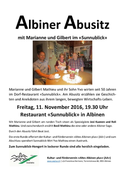 Auf Einladung des Kultur- und Förderverein Altes Albinen+. Der Eintritt ist frei. Am Schluss der Veranstaltung gibt's eine Kollekte. Alle sind herzlich eingeladen.
