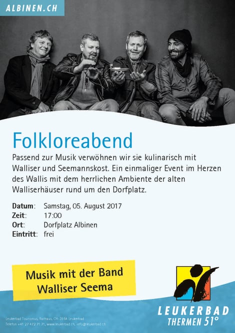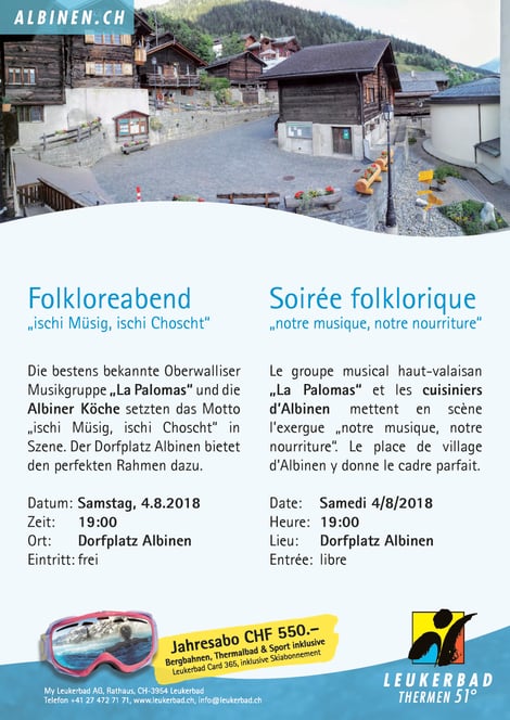 Am Samstag 4.August ist in Albinen Feststimmung angesagt. Der zur Tradition gewordene Folkloreabend findet dieses Jahr unter dem Motto "ischi Müsig, ischi Choscht" statt.